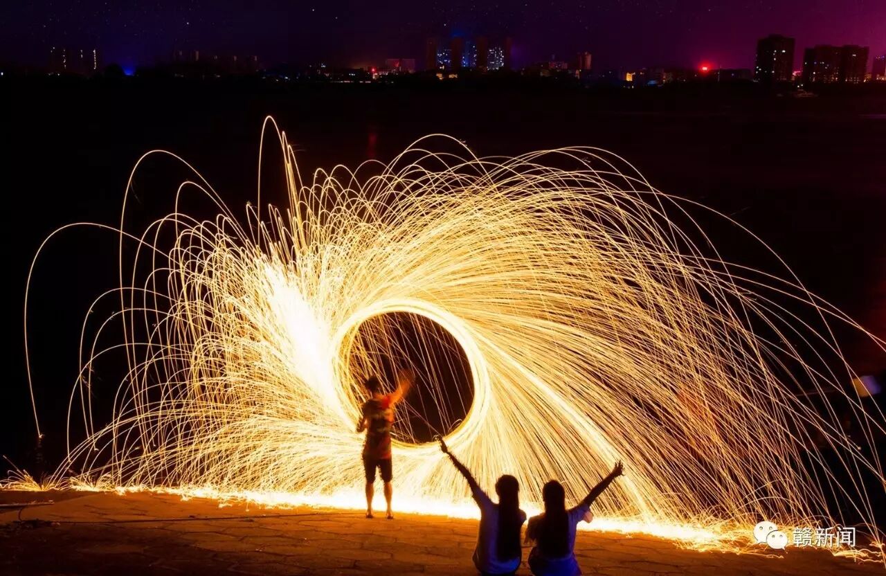 近日,在江西吉安市井冈山大挢以北的赣江边,游客和市民正在体验“光绘摄影”,火花飞溅的画面十分唯美酷炫。“光绘摄影”是指长时间曝光过程中通过光源的变化创造特殊影像效果的一种摄影方法。李小明 摄
