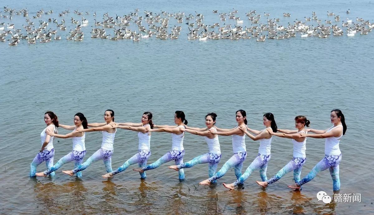 8月6日,江西省鄱阳县15名瑜伽爱好者和留守鄱阳湖的上千只大雁,演绎水上人雁和谐共融的瑜伽秀,呈现出天人合一的美丽景象。卓忠伟 摄