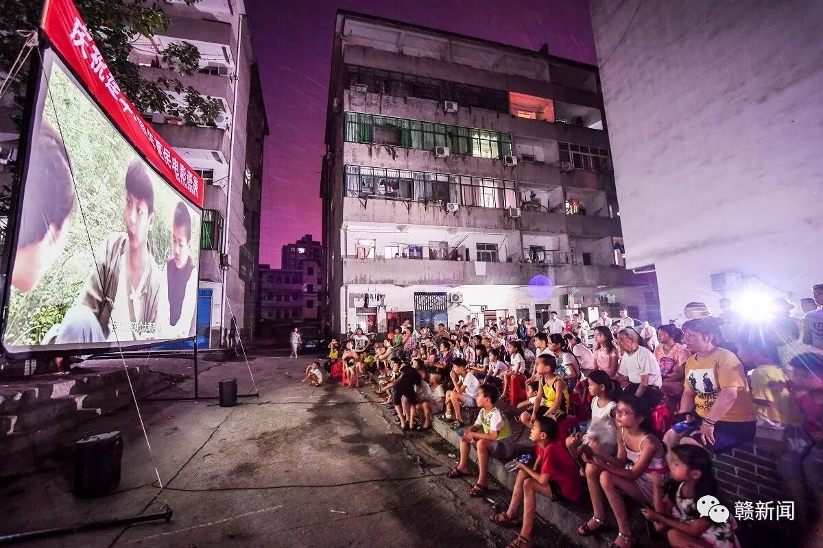 7月30日晚,江西省新余市渝水区,村民聚在一起观看抗战电影《抗日儿童团》。为庆祝建军90周年,连日来,江西新余市无线电管理局联合新余市电影公司在全市范围内开展军旅电影免费放映活动。周亮 摄