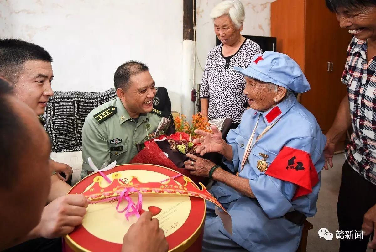 7月30日,部队官兵向老红军李宝英送上鲜花等慰问品。现年102岁的李宝英,是江西新余市唯一健在的红军战士,“八一”建军节前夕,部队官兵来到李宝英家中,为她献上鲜花和军礼,与老红军共庆建军90周年。周亮 摄