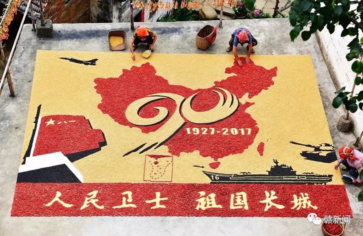 7月31日,“中国最美的乡村”江西省婺源县篁岭古村以晒秋的独特方式庆祝八一建军节90周年。农家大妈变身“乡土艺术家”,用300斤谷子、190斤朝天椒、60斤大米、80斤黑豆、10斤玉米粒拼成一幅长6米、宽5米的巨型图案,图中摆有中国版图、八一纪念碑、歼20飞机和辽宁号航母等造型。曹加祥 摄