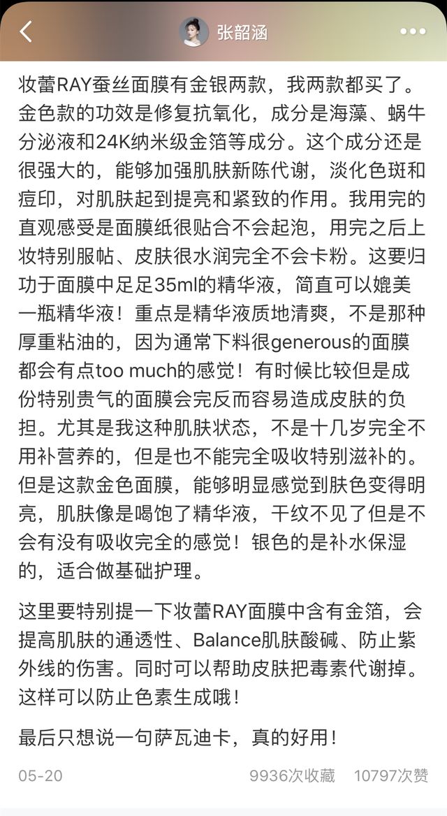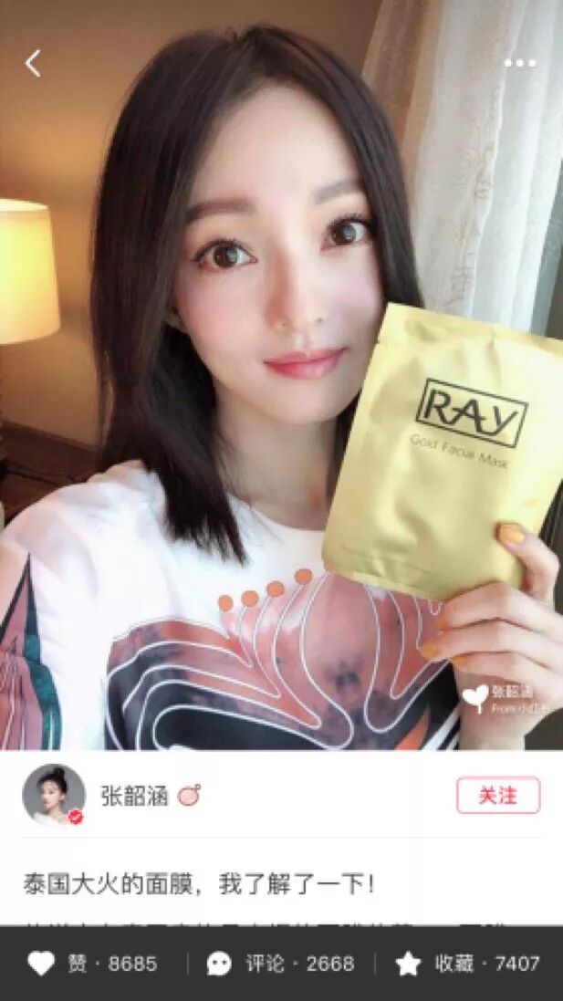 张韶涵因为听说这款是泰国卖的最火爆的面膜,在泰國屈臣氏都“疯抢卖断货”了!作为一个面膜达人,她很好奇这款面膜怎么会这么红?,于是她也买了亲测一下。妆蕾RAY蚕丝面膜有金银两款,她两款都买了。