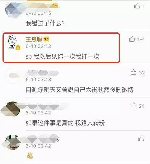 当然,随后王思聪也在下面评论了:sb 以后我见你一次打你一次↓↓↓