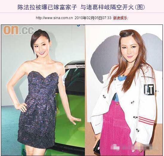2008年有媒体曝光陈法拉跟薛嘉麟的哥哥薛世恒在美国领证结婚,还收下了薛家的豪宅,但是两人都没有回应,偏偏10年诸葛梓岐接受采访的时候送上祝福默认二人已婚,被指博宣传,借人上位。