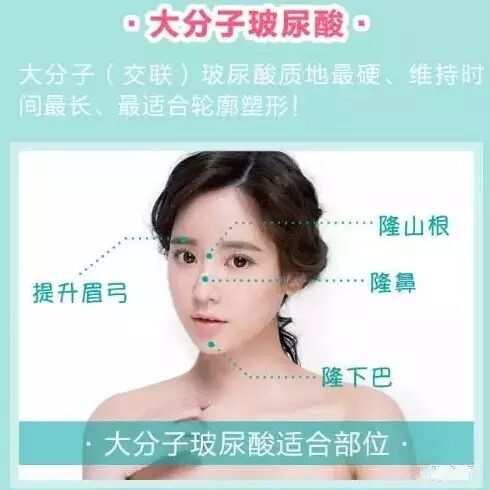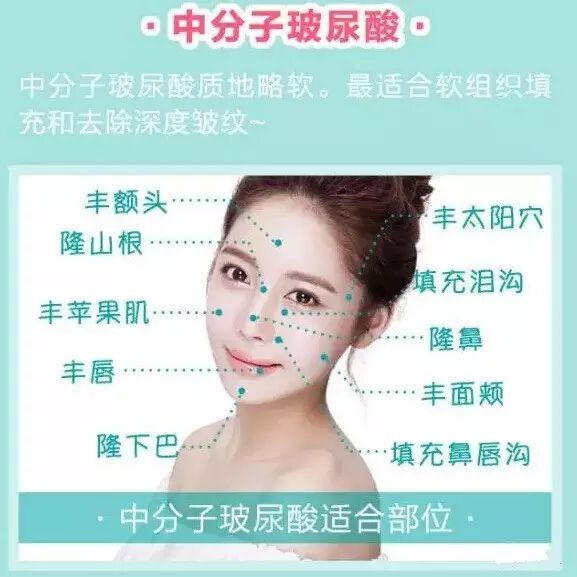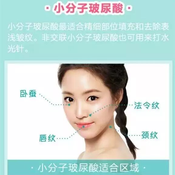 玻尿酸分为三种:大分子、中分子、小分子,它们分别适用于不同部位: