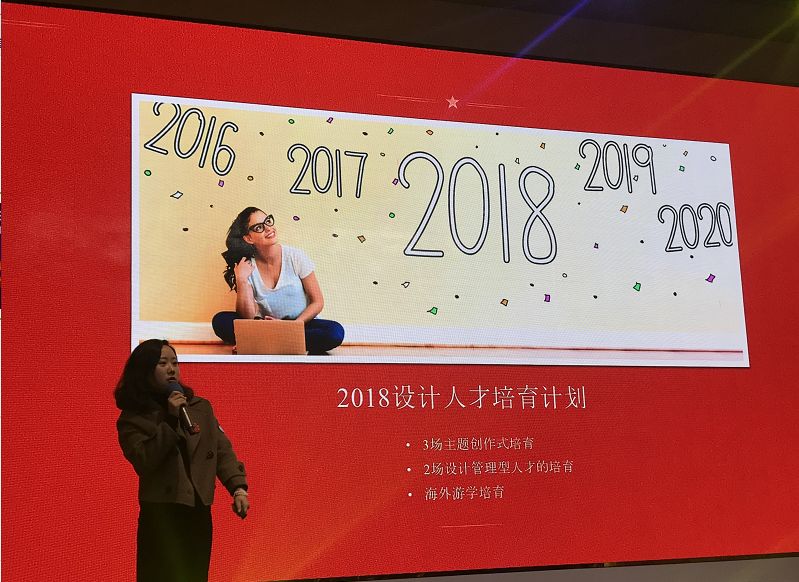 抽奖活动结束后,南京创意设计中心副主任刘晶介绍2017百名设计人才培育情况及发布2018人才扶持计划。她首先向大家介绍了百人培育计划前三期的培育情况及展示了设计成果。成果包括展示优秀学员在培训期间头脑风暴后所设计的创意产品。同时也介绍了国际游学板块——南京青年设计师纽约游学训练营的考察情况,并告诉大家会在18年加大关于国际游学的有关政策和力度,包括:3场主题创作式培育 、2场设计管理型人才的培育、海外游学培育。同时她在会上提到:18年创意设计周,将会在5月12-20日以非遗创新的活动形式亮相。并邀请在座的设计师同我们一起加入。