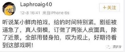 昨天,有位微博名叫“Laphroaig40”的人爆料有小鲜肉拍戏给的时间特别紧,剧组只能用真人倒模,订做了两张人皮面具,当替身拍摄。