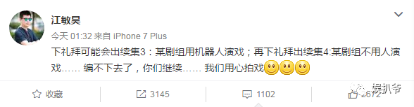 而武动的制片人还在今天发博讽刺是不是下次还要说剧组用机器人演戏,剧组可能下次都不用人演戏了...