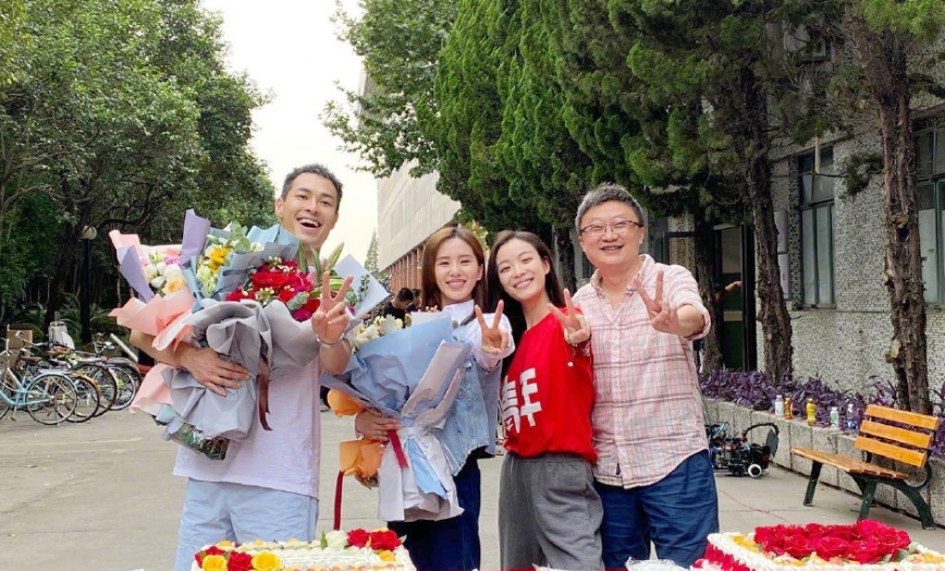 《流金岁月》杀青那天和导演沈严,女主刘诗诗和倪妮。