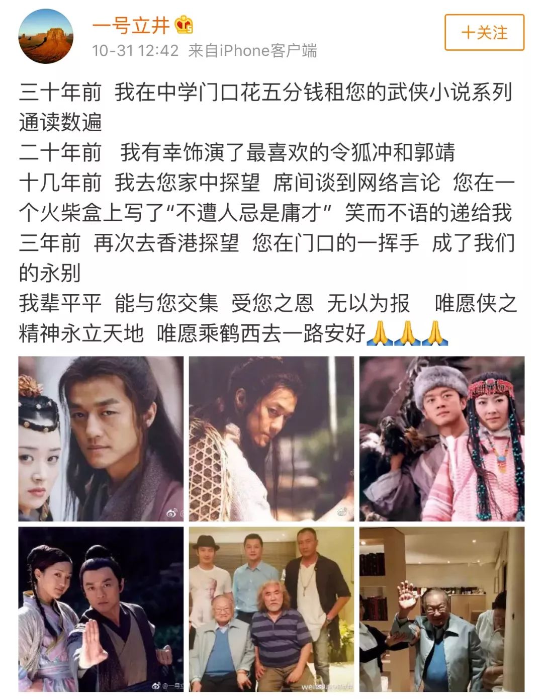 当然,2003年起,以演郭靖和令狐冲闻名的帅哥李亚鹏也发了一则深情款款的追悼微博。