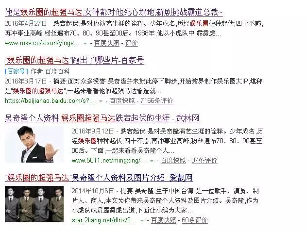 玩百度搜索久了会发现一个好玩的现象,艺人名字下方都有一个类似于品牌slogan的介绍短语,这一定不是经纪公司或者艺人团队运作的,因为有些介绍语,实在是太好笑太令人尴尬了。