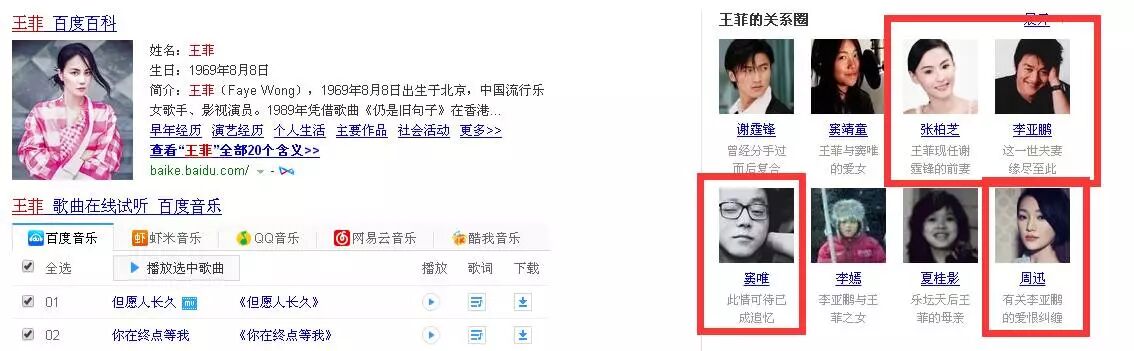 先来看我们华语乐坛Diva王菲女士的搜索结果,她的词条辐射能力果然很强,带出一连串明星(点开可看大图),前任现任、前妻前夫,弯弯绕绕带出来的全是大牌。