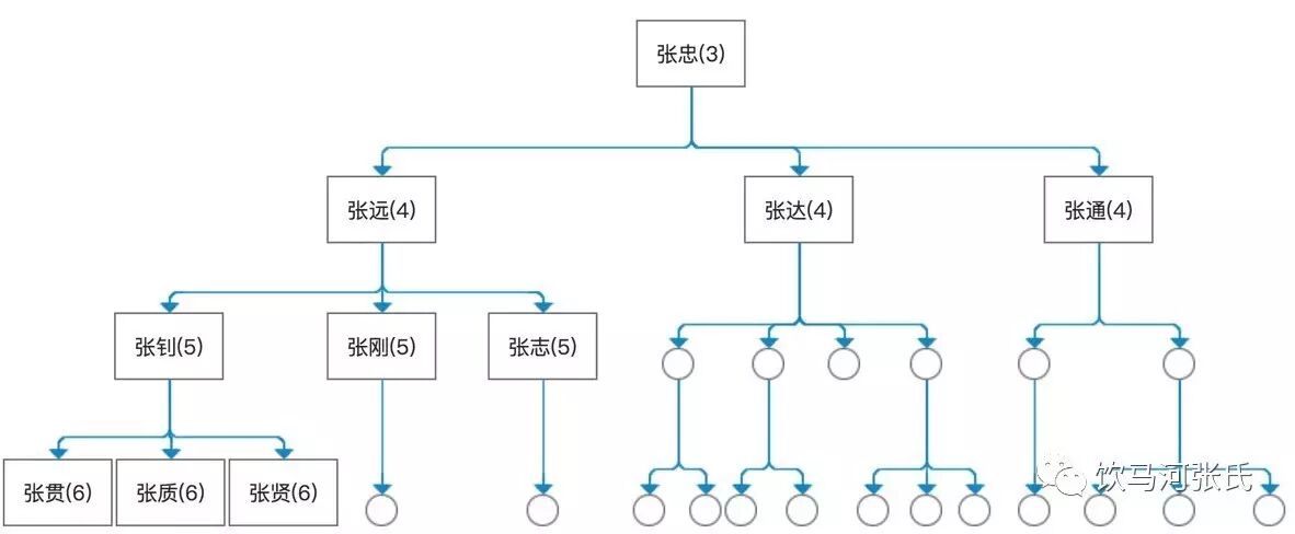 通过上图可以看出,从右到左,六世祖讳张质和张贯在五世祖讳张钊分支体系内分列为第 2 位和第 3 位,在四世祖讳张远分支体系内分列第 4 位和第 5 位,而在三世祖讳张忠分支体系内分列第 15 位和第 16 位。进而可以推出,在辈分更高的直系祖先分支中,二人的顺序号更大。因此,若八支和九支的起源发生在第六世,则基于五世祖讳张钊及以上体系均无法满足。