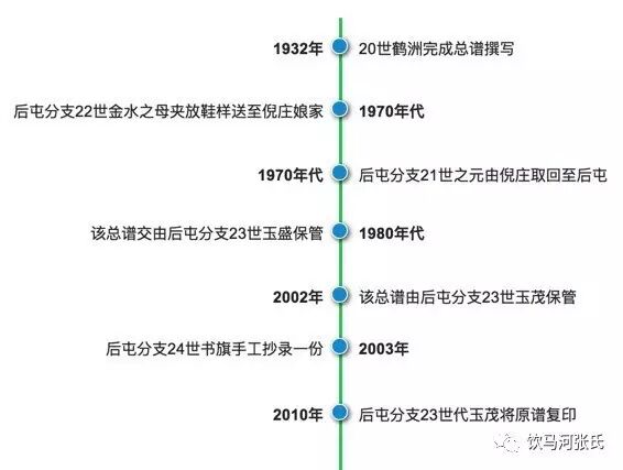 由此我们可以知道,这份全谱与后屯分支关系密切,而后屯分支正是五世祖讳张钊的直系后裔,且后屯分支的世代和年代关系与鹤洲老先生的完全一致。这也从某种角度进一步印证了上面的推论。