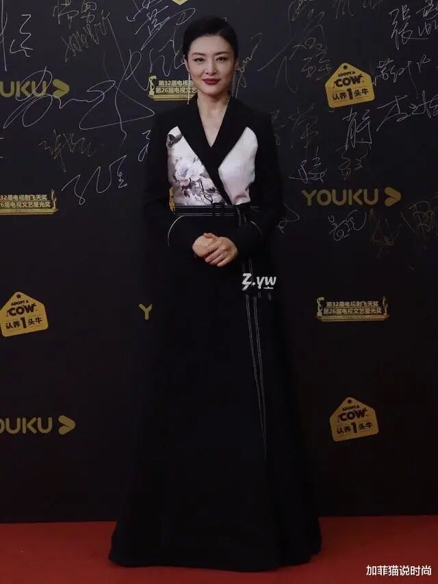 周涛选择的这身衣服,颜色以及前面的拼色都比较大气,不规则的笔墨印花的点缀,更加能彰显出优雅内涵之美,不显得单调。小v领子修饰脖颈线条,脸型也显瘦显立体很多,气质干练典雅。拼接的黑色丝绒半身裙,拖地风提升气场,这么长的白色线条勾画出了的3D线条,明亮吸睛,时尚又不会太小家子气。