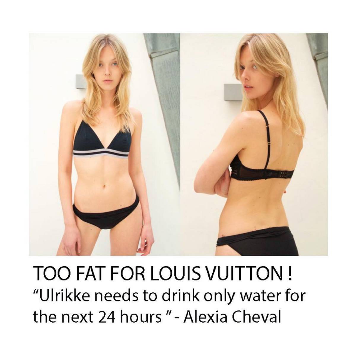 20岁的瑞丹麦模特Ulrikke Høyer曾在Instagram上发布自己的内衣照,并配上“LV觉得我太瘦”的文字。在今年的LV早春秀中秀导嫌她太胖,要求她在秀前24小时内只能喝水。