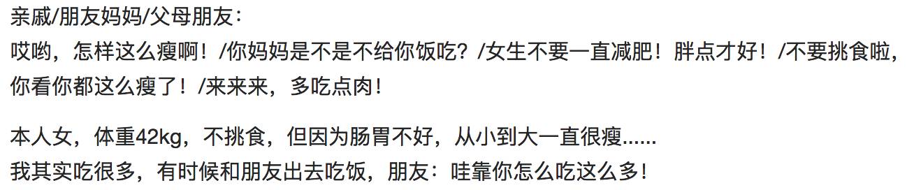 很多时候体重过轻比体重过重对身体的损害还大,以后遇到那些真心想要长胖健康的人还是要适当地收起我们的幽默,你以为的玩笑话有时候就是他们的痛处。