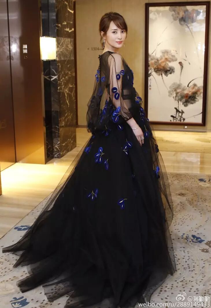 《时尚先生》20周年庆典。蒋勤勤身穿黑色薄纱透视刺绣蓬蓬裙,内搭黑色蕾丝吊带内衣,端庄知性美尽显。