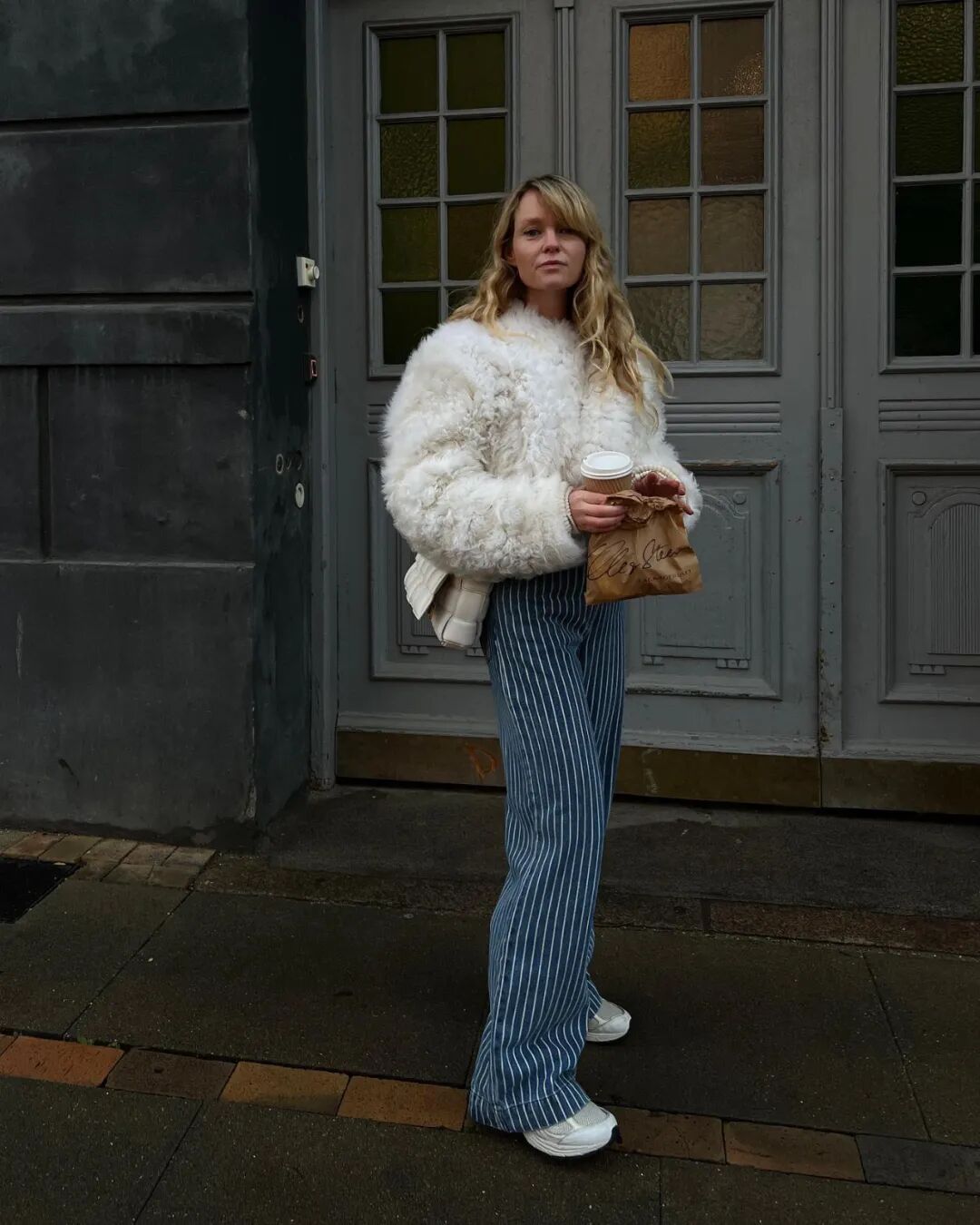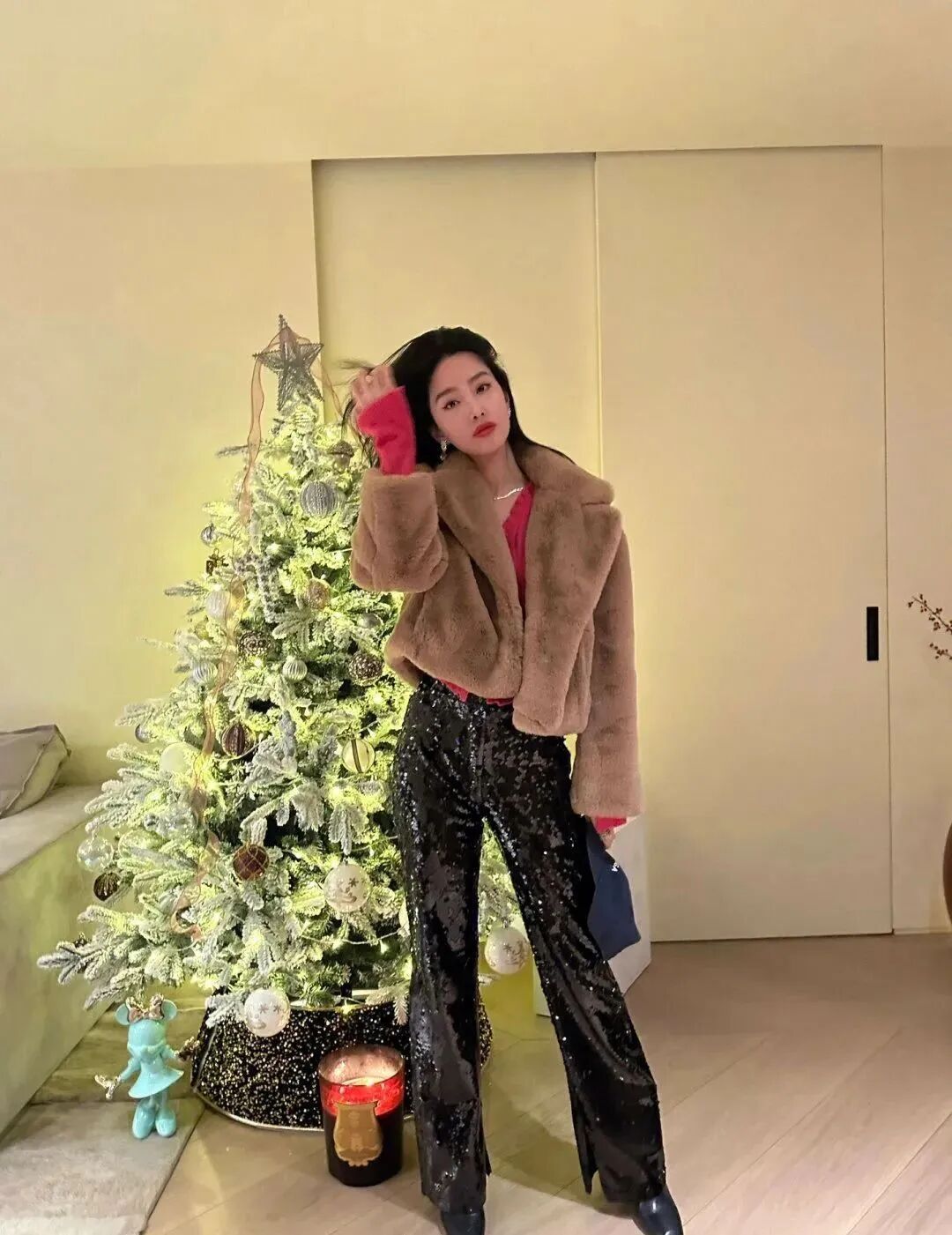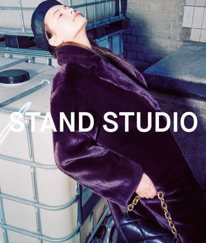 杨采钰大概每年冬天都要入手一件Stand Studio,去年还穿过一款浅色仿皮草翻领外套,今年她购入了棕色的款式,短短的也挺有中古皮草的韵味。