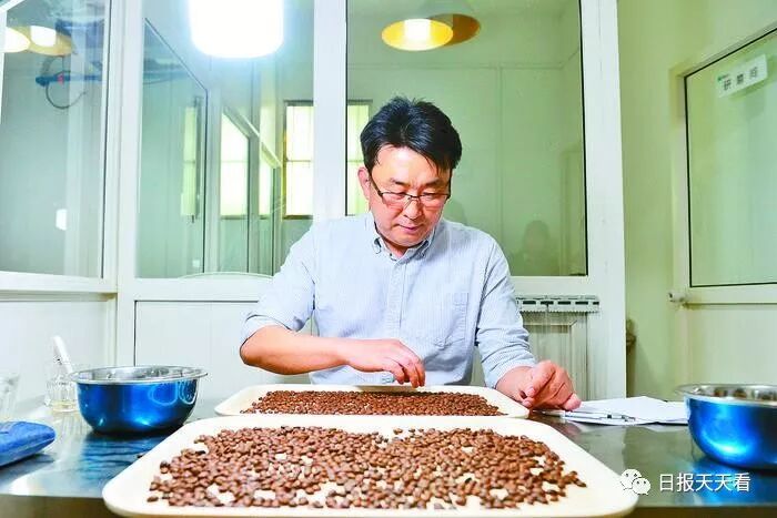 金范认真熟练地筛选烘焙好的咖啡豆中残次豆,保证咖啡豆完美的品质。