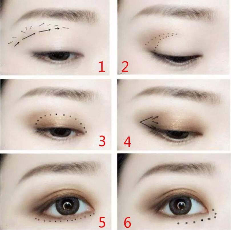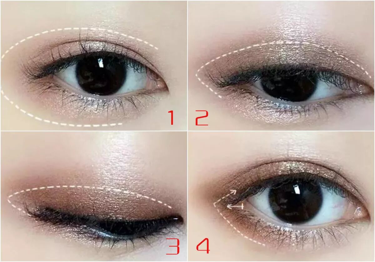 3&4.和前三种妆容同样的步骤,用棕色在双眼皮层处加深,然后用深棕色或灰色在眼尾三家处涂抹来拉长眼角;