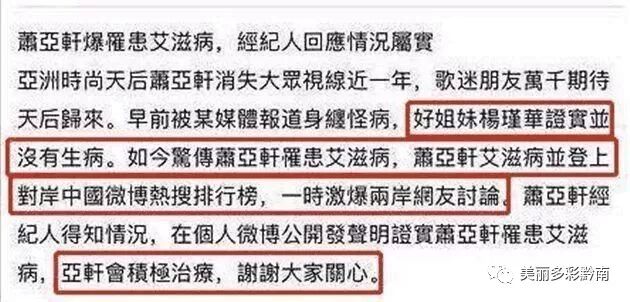 但是,很快萧亚轩的经纪人在微博上否认了萧亚轩身患艾滋这个消息,经纪人称萧亚轩只是嗓子出现了问题。那么网上为什么会传出萧亚轩身患艾滋这样的消息呢?