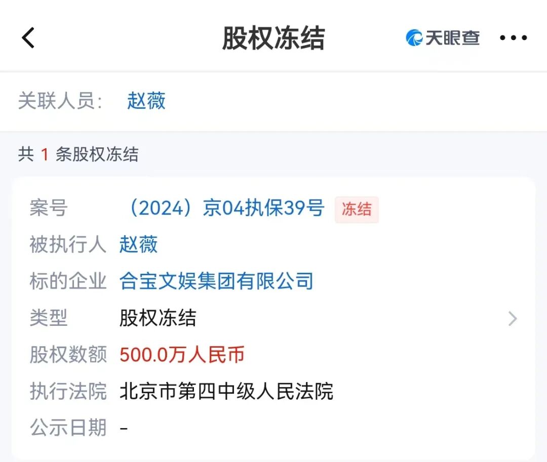 事实上,早在2021年4月,赵薇名下多个所持股权就陆续被冻结,冻结股权标的企业涉及芜湖东润发投资有限责任公司等,合计金额超过千万元,冻结期限至2024年4月末。