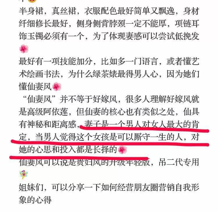 仙妻风如何操作呢?人为的营造自己很贵又很神秘。为什么要叫仙妻呢?根据钓二代女学大师的解释,妻子是一个男性对女性的一种肯定,当你的仙妻风塑造成功后这个男性就会对你进行长期的投入。(真的逻辑鬼才)