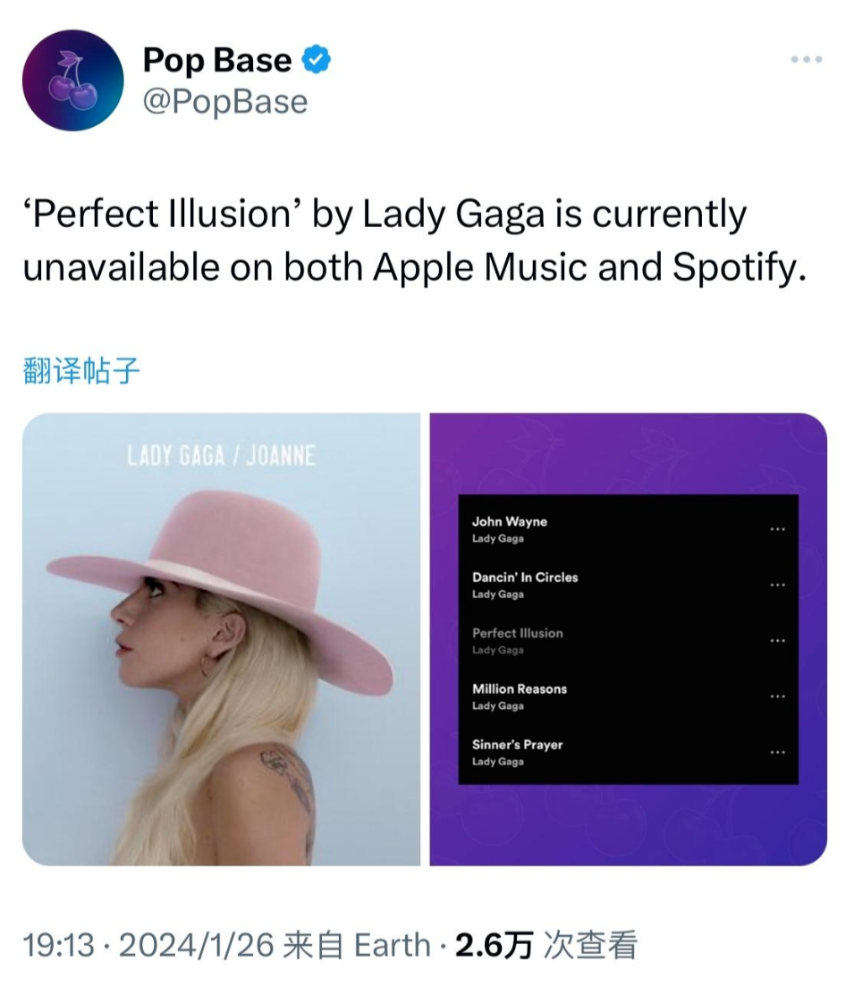 当地时间1月26日,有粉丝发现 Lady Gaga 的经典音乐作品《Perfect Illusion》遭到全网下架,在美国的互联网上全部都撤出了专辑《Joanne》的歌曲曲目单。随后,在中国的 Apple Music 上,该歌曲也下架了。这一消息让许多歌迷和业界人士感到十分意外和困惑。