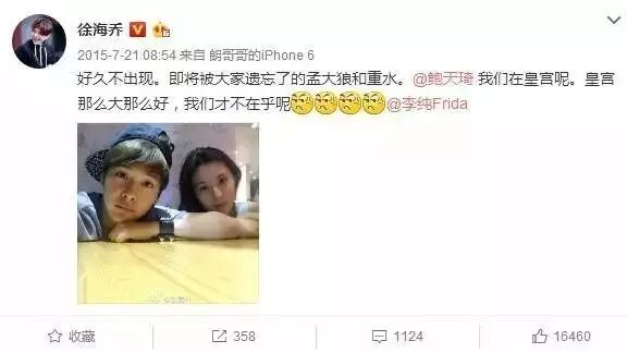 还与戏中的“轻水”鲍天琦传出了绯闻,两人更是戏中戏外互动频繁,甚至在某综艺中,两人当众牵手,徐海乔还对鲍天琦说:“以后什么都听你的!”整个画面也是让人激荡人心,不过事后徐海乔依旧说自己是单身。
