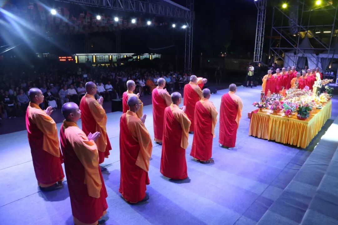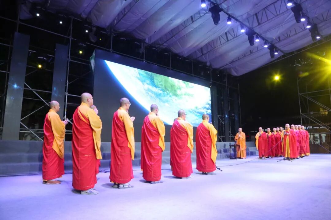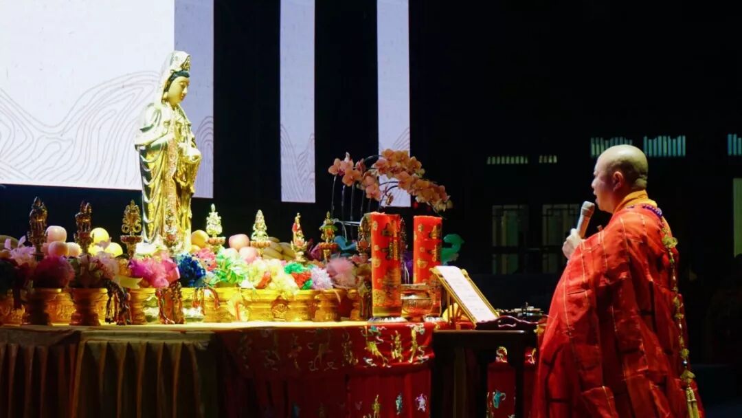 随后,本寺护法居士、著名歌手黄品源居士演唱了和慧之法师共同创作的佛曲《源来如此》。最后,与两岸艺术家同台共唱《祈祷》,共同祈愿与会大众中秋平安、吉祥!