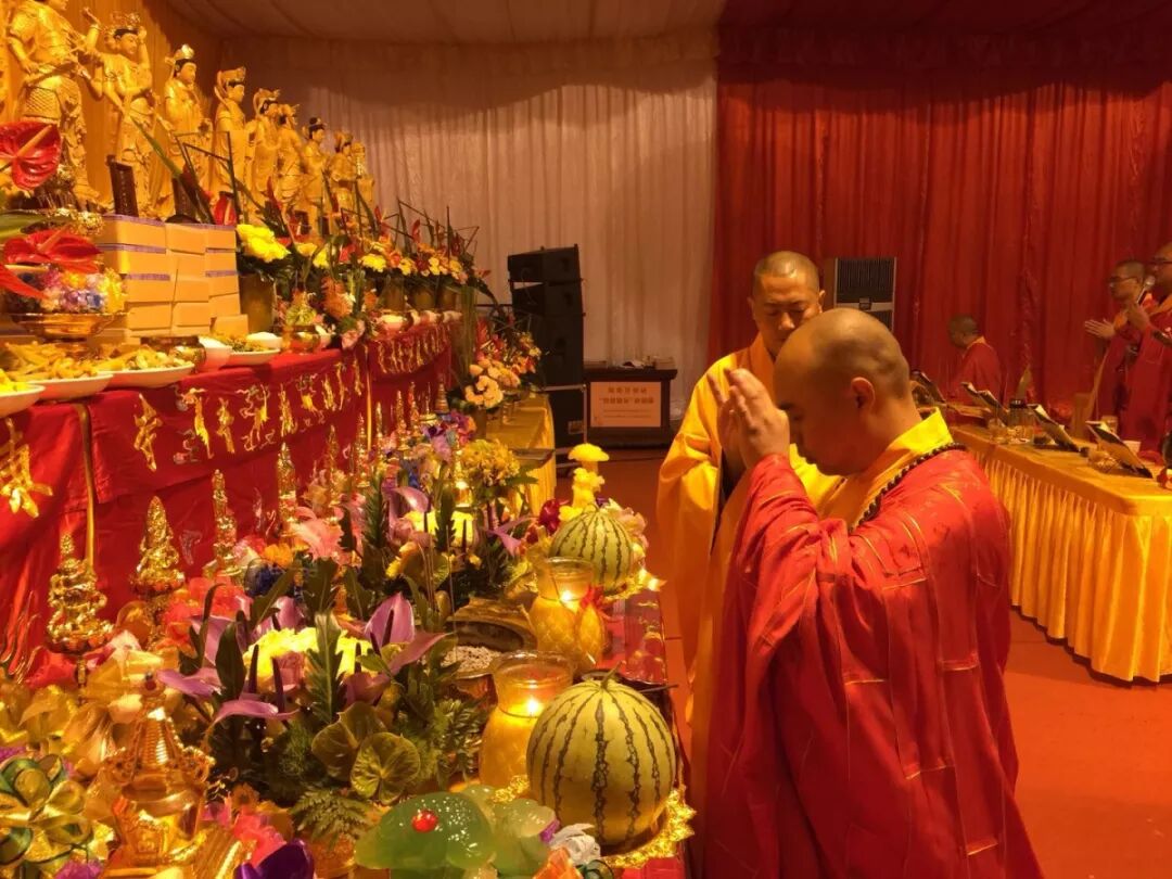 9月23日晨五时,寺内香烟袅袅、梵音阵阵。本寺全体法师及护法善信云集慈慧讲堂内,举行庄严的斋天仪式。本寺监院演惺法师拈香主法。