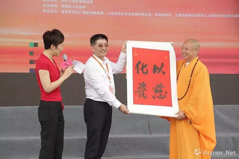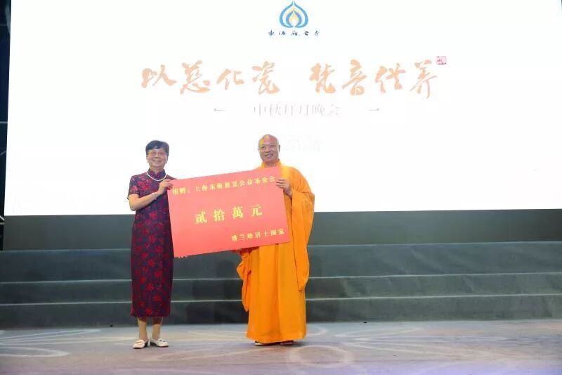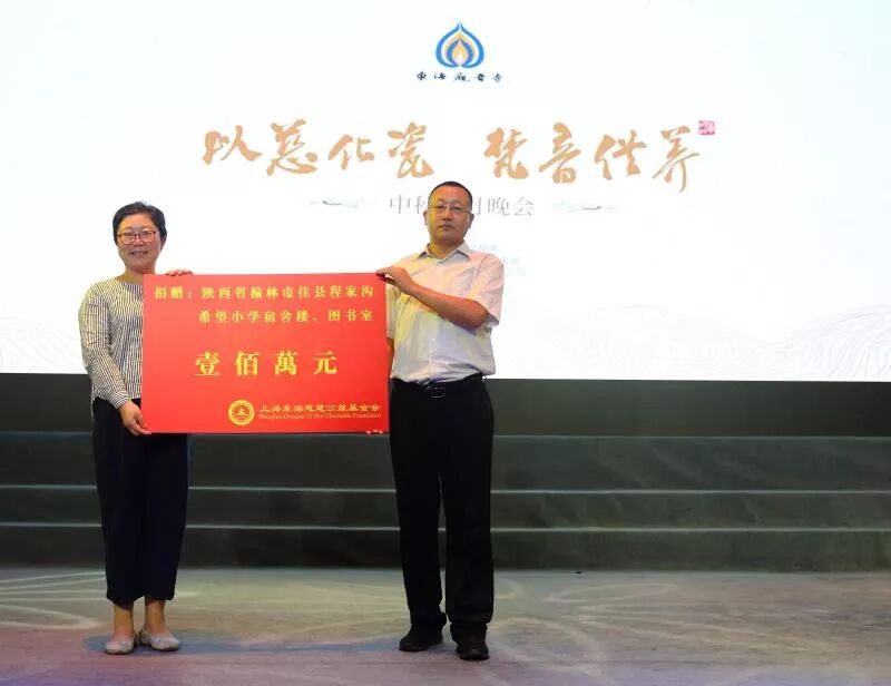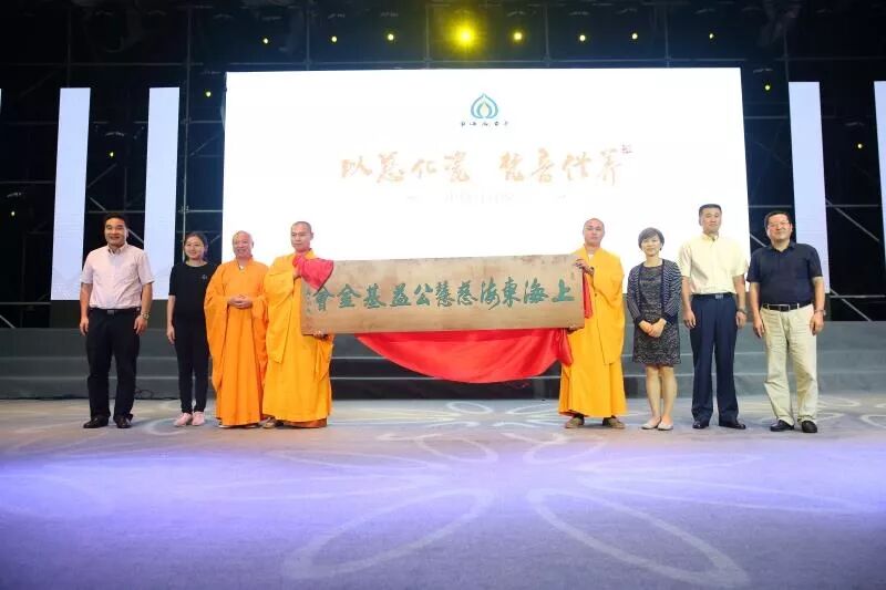 在观看一段慈善纪录片之后,区委常委、统战部部长包蓓英女士;市民宗委佛道处处长何健先生;市民宗委法宣处处长姜斌先生;区委统战部副部长、民宗办主任余浩洁先生;市民政局社团局基金处姜琦女士;上海东海慈慧公益基金会理事长慧之法师共同为上海东海慈慧公益基金会揭牌。中国书法家协会主席苏士澍先生欣然为本基金会题写匾额。随后基金会理事长慧之法师代表基金会接受三位信众捐赠,孙志祥秘书长代表基金会向榆林捐赠善款。接受爱也是为了传播爱,在温馨的氛围中合唱团唱响基金会会歌《慈慧一家人》。