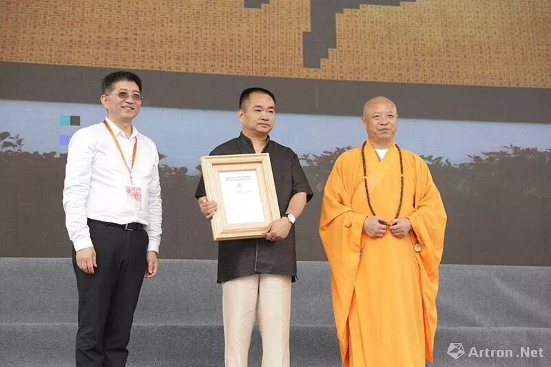 由艺术家子轩创作、陈光明居士收藏的(长6.65米,宽3.46米,5437片超薄瓷片组成)大世界吉尼斯之最瓷板《金刚经》捐赠仪式