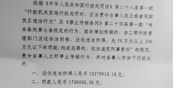 湖北省襄阳市保康县市场监督管理局认定,2018年1月1日至2021年7月,相关公司在涉及传销的主营业务上的营收共91.71亿元,获利1927.99万元。
