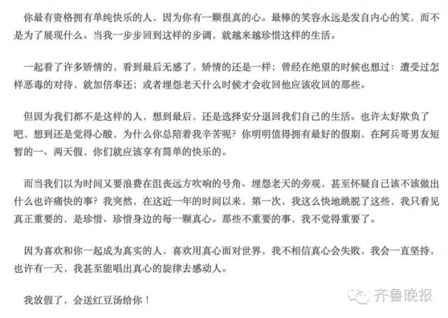 “我没有对不起任何人,也从来没有对不起自己。纵使有些无奈,日子还是会像过去的每一天一样,把握每一个当下。渴望回归平静的、私人的、生活的”。