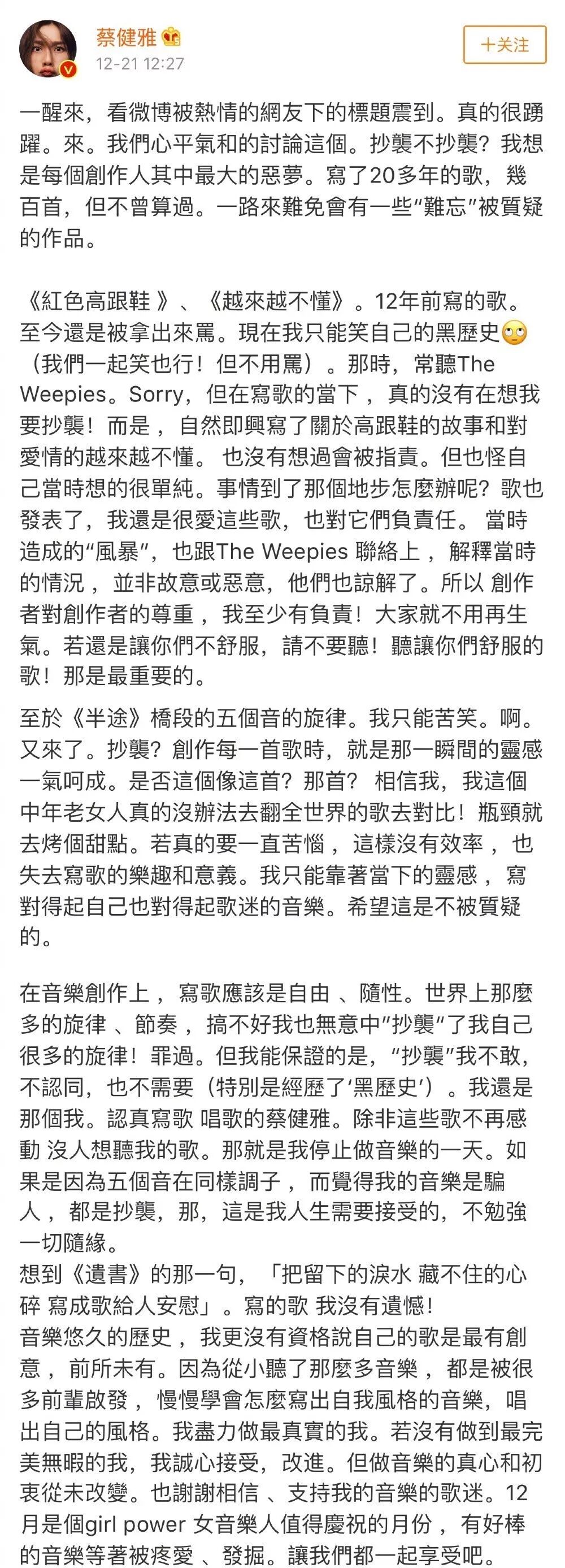 近日,蔡健雅新歌《半途》被质疑抄袭了Taylor的《Safe and Sound》。还有网友这样总结:蔡健雅的《抛物线》抄sara bareilles的gravity,《红色高跟鞋》抄Take It From Me,《越来越不懂》抄gotta have you,《被驯服的象》抄sweet dreams!对此,有网友表示要抵制抄袭,也有网友表示无所谓,歌好听就可以了。今天中午,蔡健雅发长文回应:写了20多年的歌,难免会有一些“难忘”被质疑的作品。但她自己不敢、不认同也不需要抄袭。
