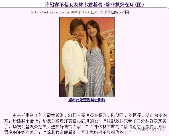 然而,没过多久,她又劈腿了。2004年,拍《男丁格尔》的时候,跟坤达传出了绯闻,那时许绍洋的态度是:只要不捉奸在床,就相信她!
