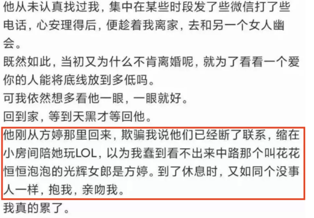 虽然她在长文中句句都是控诉,但又有那么多对过往甜蜜时光的回忆,即使男方多次出轨,也能看出她对这段感情仍十分不舍。