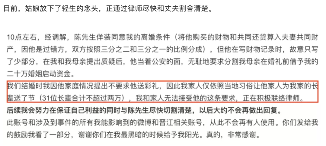 目前,姑娘放下了轻生的念头,正通过律师尽快和丈夫割舍清楚。