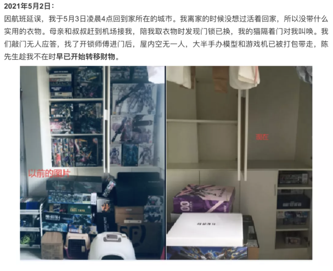 4小时后,她在朋友的帮助下收拾好所有物品,搬离了陈翔家。
