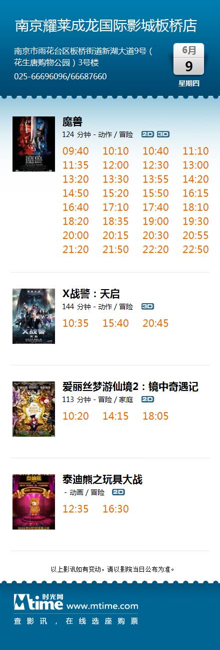 南京耀莱成龙国际影城板桥店6月9日星期四影讯