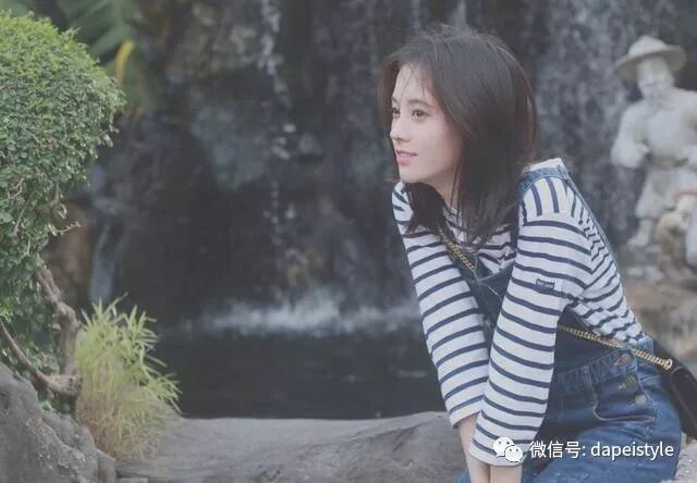 背带裤作为减龄神器,鞠婧祎这种走清新甜美路线的自然不会放过,内搭条纹T,经典又耐看。