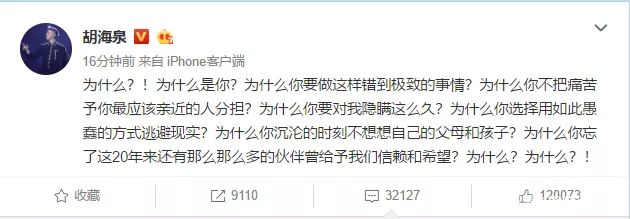 而作为海泉组合中的另一名成员,胡海泉是痛心疾首,在微博连续发了十个为什么!原文如下:为什么?!为什么是你?为什么你要做这样错到极致的事情?为什么你不把痛苦予你最应该亲近的人分担?为什么你要对我隐瞒这么久?为什么你选择用如此愚蠢的方式逃避现实?为什么你沉沦的时刻不想想自己的父母和孩子?为什么你忘了这20年来还有那么那么多的伙伴曾给予我们信赖和希望?为什么?为什么?!