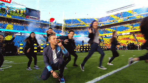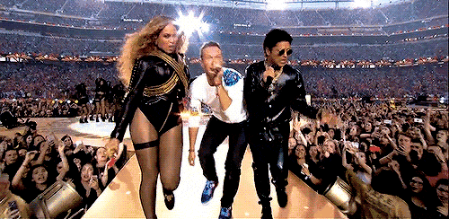 2016年则是冷玩乐队coldplay联手Beyoncé&火星哥,一起完成中场秀表演。一开始,coldplay先带领全美人民开始蹦迪狂欢——