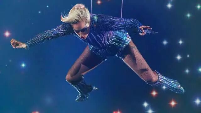 2017年也炒鸡精彩——Lady Gaga独挑大梁。一开场,她就在天上唱了一段翻译过来便是“我爱美国这片土地”的freestyle,然后她真的很爱这片土地——