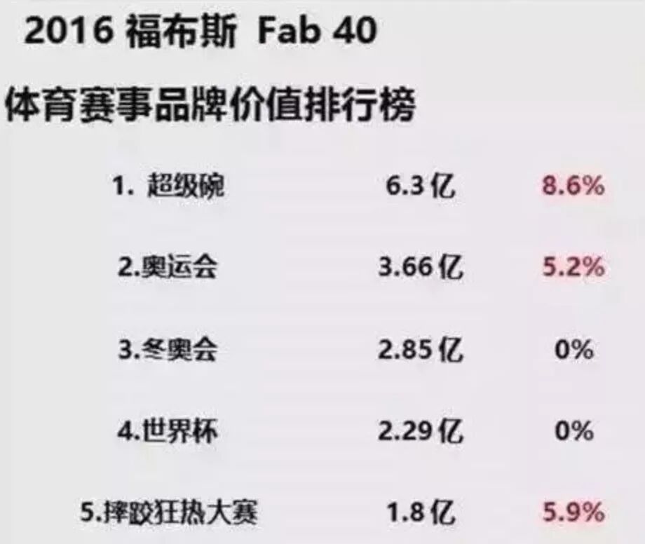 但根据权威财经杂志《福布斯》2016公布的数据,超级碗比奥运会和世界杯足球赛加起来都高,牢牢坐稳最具商业价值体育赛事的宝座。