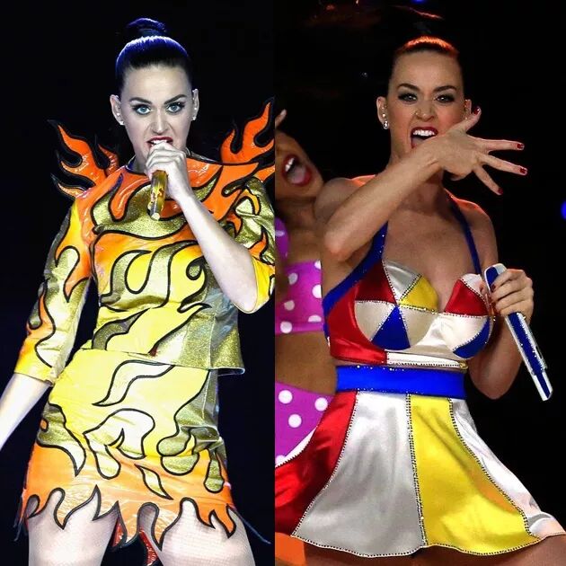 在最后,水果姐迅速换装,吊上威亚,站在会喷烟花的小飞机上以热单《Firework》结束这场中场秀。