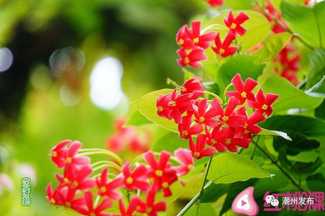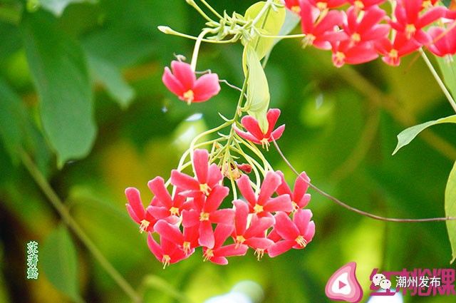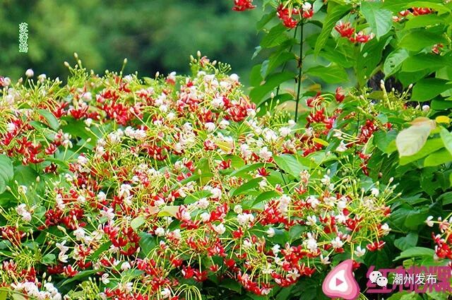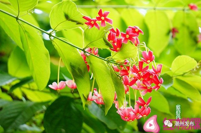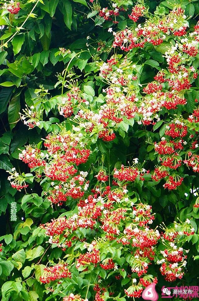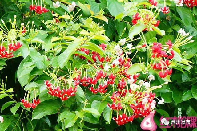 由于使君子花期长短参差,花开有先后,同时一株花,往往白红相间,相映相衬。驻足远观,使君子花披在棚架上,都开满了花赶趟儿,蔚为壮观;凑近仰望,一串串花穗坠入心房,花里带着甜味儿,沁人心脾。