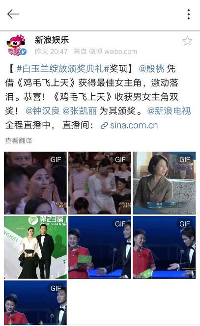 因为殷桃之前已斩获飞天、金鹰的最佳女主,这一次的奖,让她实现了最佳女主角的大满贯。